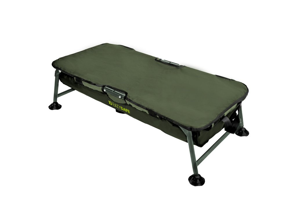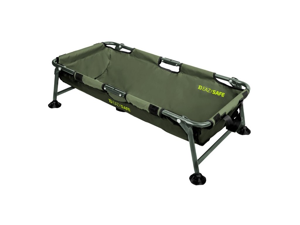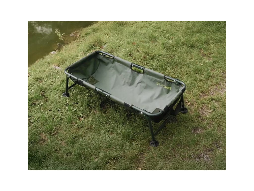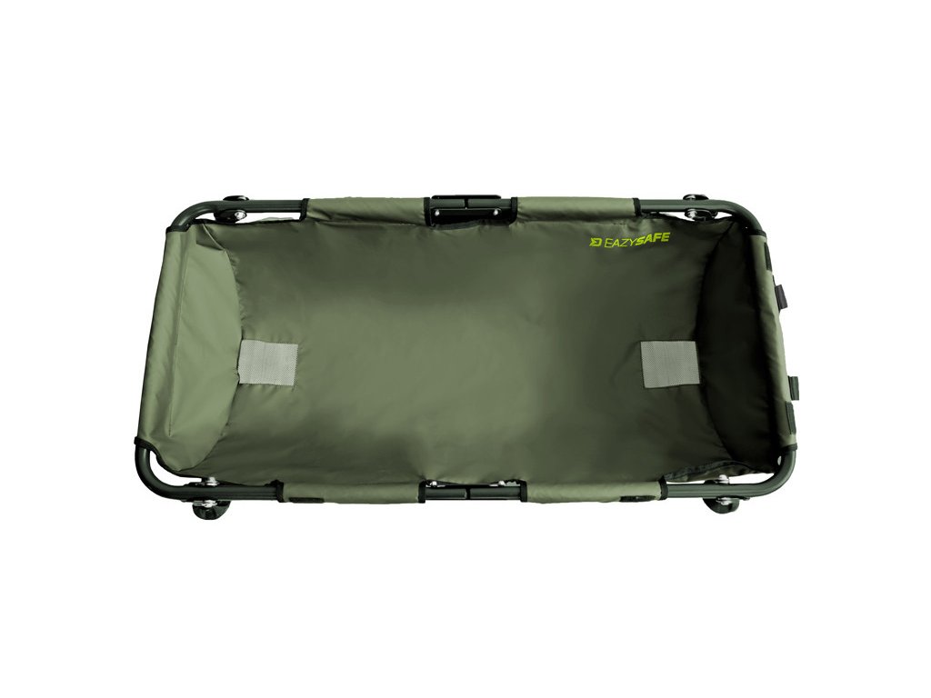 Az alátét alapját egy nagyon erős, 22 mm átmérőjű csővel rendelkező vas szerkezet alkotja. Ennek köszönhetően a kád kiváló stabilitással rendelkezik, és nem áll fenn a felborulás vagy a zsákmány kezelése közbeni sérülés veszélye. A gumírozott felületű anyag használata több előnnyel jár. Horgászat befejezése után elegendő szárazra törölni, így nem kell sokáig várni, amíg megszárad. Ráadásul nagyon könnyen tisztítható, és nem szívja magába a kellemetlen szagokat, amelyek aztán az autójában terjedhetnek szállítás közben. Az extrém tesztek során az egész horgászlessátor problémamentesen elbírt akár 75 kg statikus terhet! Mindkét szélen hálós anyag van bevarrva, amelyen keresztül a víz könnyen el tud folyni belülről. Az EAZYSAFE fedőanyaggal is rendelkezik, amely tépőzárral van ellátva. Így bezárhatja a halat, ha például elő kell készítenie a fényképezőgépet, vagy vizet kell merítenie a zsákmány meglocsolásához. A lábak csuklós talpakkal vannak ellátva, amelyek alkalmazkodnak a terephez, és megakadályozzák a talajba való süllyedést puha aljzat esetén. A tervezés során azonban a szállításra is gondoltunk, ami a termék másik erőssége. Középen a szerkezet okosan van osztva, így egyszerűen félbehajtható, és a fogantyúk segítségével kényelmesen szállítható.