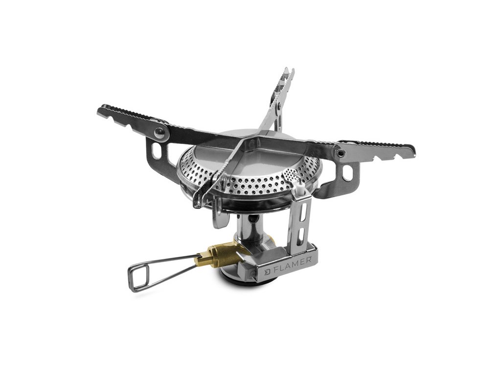 A főző kompatibilis a 7/16-os menettel ellátott, önzáró szeleppel rendelkező propán-bután patronokkal. A maximális egyszerű kezelés érdekében a FLAMER praktikus gázáramlás-szabályozással és piezoelektromos gyújtással van felszerelve. Ennek köszönhetően többé nem lesz szüksége gyufára vagy öngyújtóra.