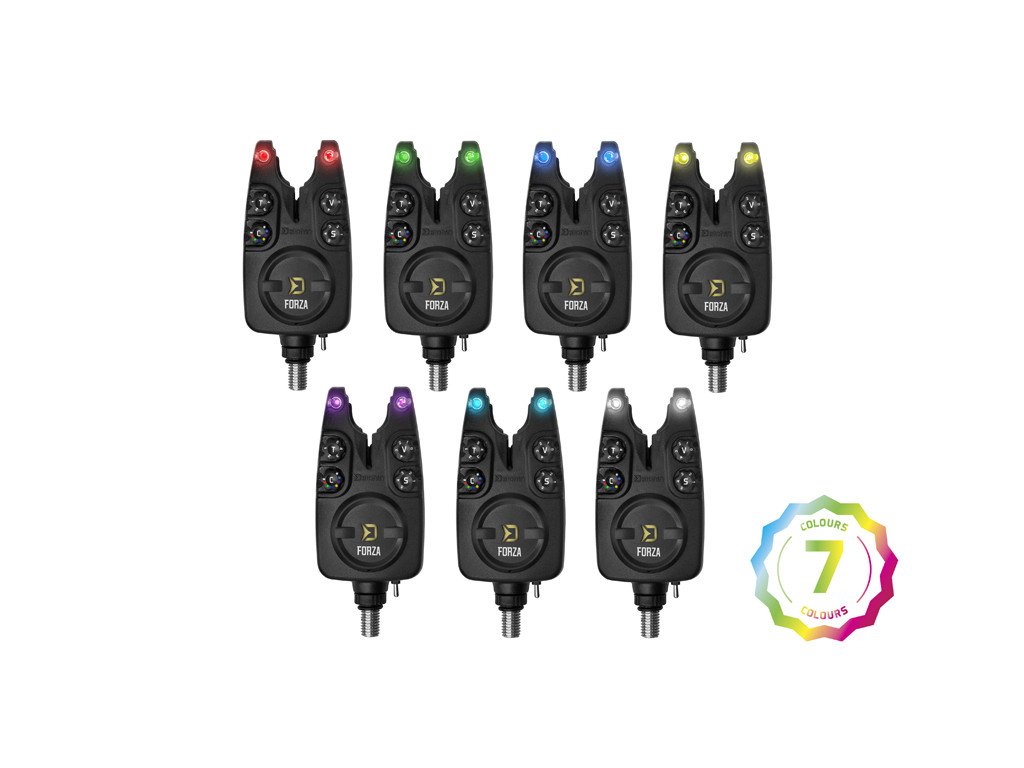 A Delphin FORZA Life+ egy kapásjelző szett vevőegységgel, amely minden körülmények között megbízható fény-, hang- vagy rezgőjelzést biztosít. A kapásjelzők és a vevőegység teste fekete, masszív ABS műanyagból készült, ami garantálja a mechanikai sérülésekkel szembeni ellenállást. A hosszú élettartamhoz hozzájáruló tényező az abszolút vízállóság is. Minden kapásjelző egy kar segítségével átkapcsolható nappali vagy éjszakai üzemmódba. Éjszakai üzemmódban a helyzetjelző LED világít, amelynek köszönhetően mindig áttekintést kap a horgászbotjai elhelyezkedéséről. A kapásjelzők az opcionális paraméterek széles skáláját kínálják. A jelzés hangszíne (T kapcsoló) és az 1-9 cm közötti érzékenység (S kapcsoló) szükség szerint akár öt lehetőség közül is beállítható. „Esés” vagyis visszahúzás esetén eltérő hangjelzéssel figyelmezteti Önt. A hangerő szintén öt különböző fokozatban állítható be, ahol a 0. szint a néma üzemmódot jelenti. A FORZA Life+ szett kapásjelzőinek vitathatatlan előnye a választható 7 jelző LED szín. Mindenki kiválaszthatja a kedvencét, és ha változásra vágyik, egyszerűen kiválaszthat egy másik színt a „C (szín)” forgókapcsolóval, így nem kell új kapásjelzőt vásárolnia. Az alsó részen található egy 2,5 mm-es csatlakozó bemenet a világító kapásjelző csatlakoztatásához. Minden kapásjelző emellett rendelkezik menetekkel az akasztásgátló rögzítéséhez, amelyek szintén a csomag részét képezik. A jelzők mellé ráadásként egy masszív szállítótáskát és a vevőhöz egy asztali tartót kap!