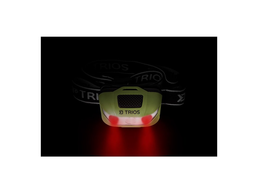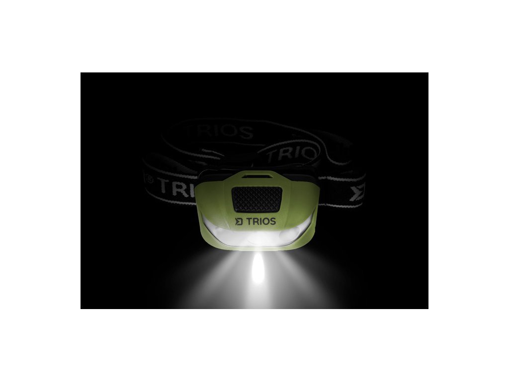 A lámpa teste rugalmas pánton található, amelyen a Delphin logó és a TRIOS név látható. A lámpát a fejlámpa tetején található masszív fekete kapcsolóval lehet bekapcsolni. Fejlámpa 3 fehér világítási szinttel. Egy kattintásra a lámpa 70%-os teljesítménnyel világít, és 5 órán át bírja, második kattintásra 100%-os teljesítménnyel világít, és 3,5 órán át világít, harmadik kattintásra 30%-on világít, és az akkumulátor üzemideje akár 12 órára is meghosszabbodik. A gomb hosszabb ideig tartó nyomva tartásával aktiválhatja a piros oldalsó LED-eket, amelyek világíthatnak, villoghatnak, vagy SOS jelet adhatnak.