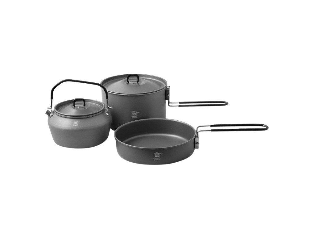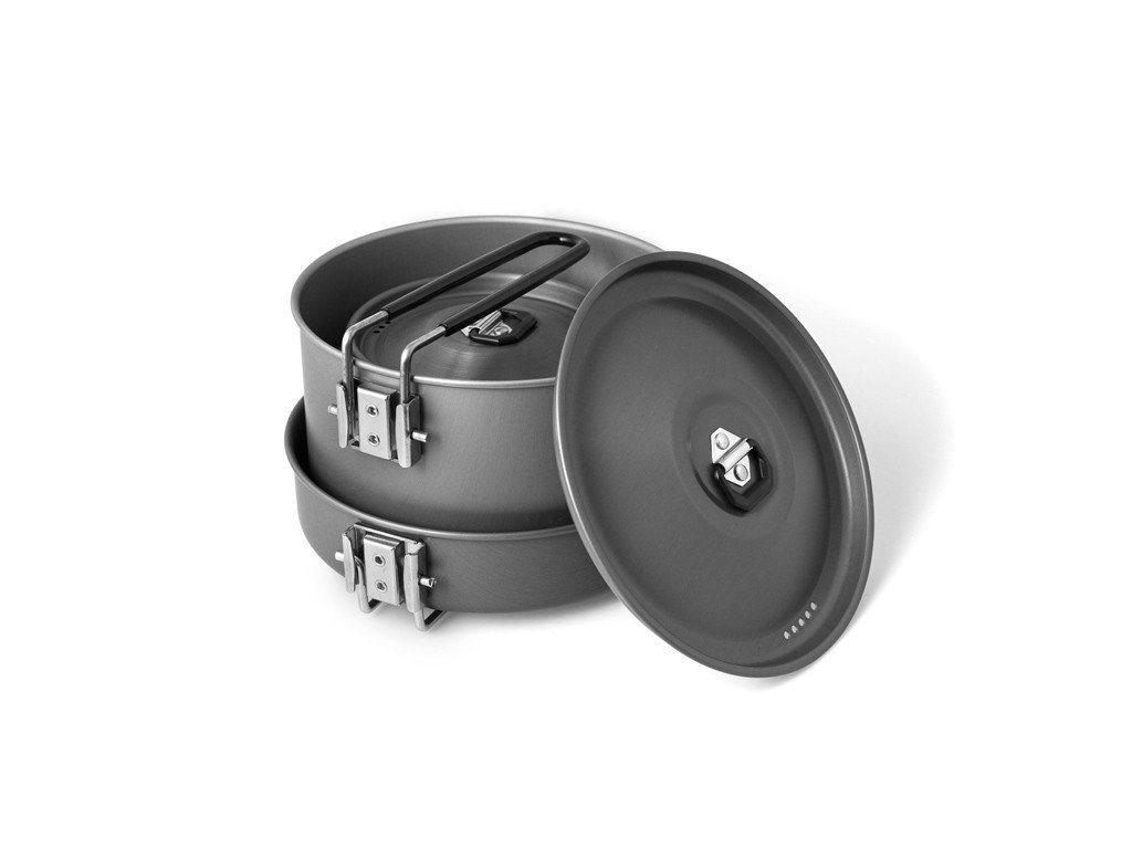 Kiváló minőségű és könnyű anyagból készültek. Ez a készlet egy 600 ml űrtartalmú, 181x175x49 mm méretű serpenyőt, egy 1500 ml űrtartalmú, 173x168x122 mm méretű fazekat és egy 600 ml űrtartalmú, 152x147x96 mm méretű vízforralót tartalmaz. Mindhárom edény praktikus fogantyúval rendelkezik, amelyet műanyaggal vontak be, hogy ne égjen meg. Most már semmi sem akadályozza meg, hogy kalandokra induljon a természetbe. Ez a készlet kiegészíthető a Delphin Carparth FOODY étkészletünkkel is.