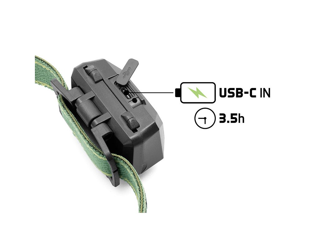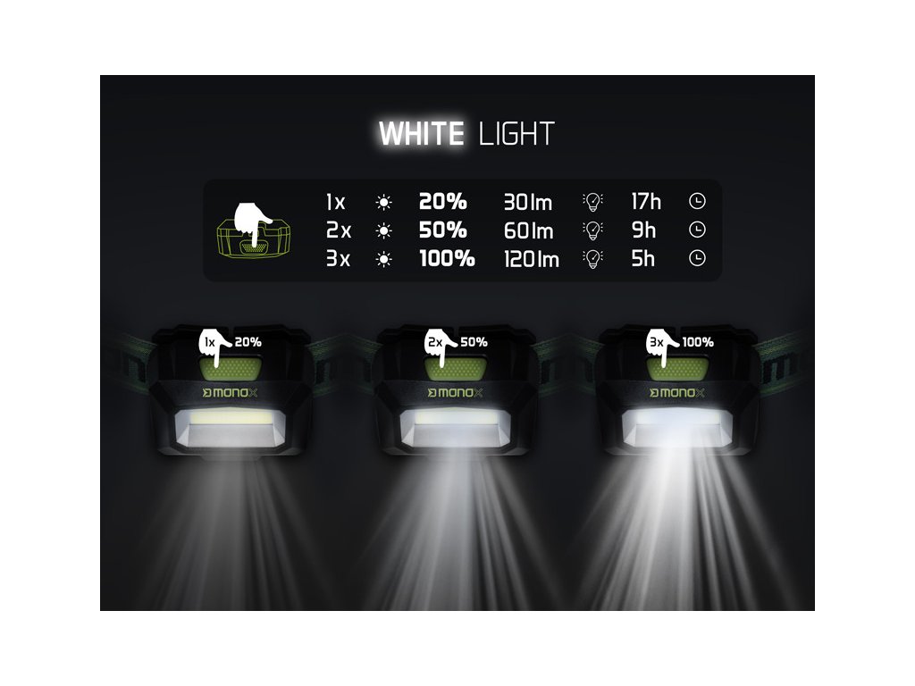 Fehér fény három világítási módot kínál. A kapcsoló gomb első megnyomásakor a fejlámpa 20%-os intenzitással világít, és ebben a módban akár 17 órán keresztül is világít. Az ismételt megnyomás elindítja a második módot 50% -os intenzitással és 60 lm fényerővel, míg az akkumulátor üzemideje 9 óra. A harmadik kattintással aktiválódik a legerősebb üzemmód 100% -os intenzitással és 5 órás üzemidővel. A gomb hosszabb lenyomásával aktiválódik a zöld fény, amelynek két üzemmódja van. Az elsőben 100% -on világít 12 órás üzemidővel, míg a következő kattintással az intenzitás 50% -ra csökken, ami hihetetlen 40 órára növeli az akkumulátor üzemidejét. A zöld fény előnye, hogy nem vonzza a bosszantó rovarokat, amit különösen a forró nyári estéken fog értékelni.