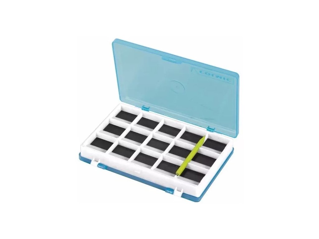 Praktikus mágneses doboz horgok tárolására. Ez a kétoldalas doboz egy műanyag ceruzával is rendelkezik, mágnesekkel a horgok kényelmes kivételéhez a mágneses mezőből.
