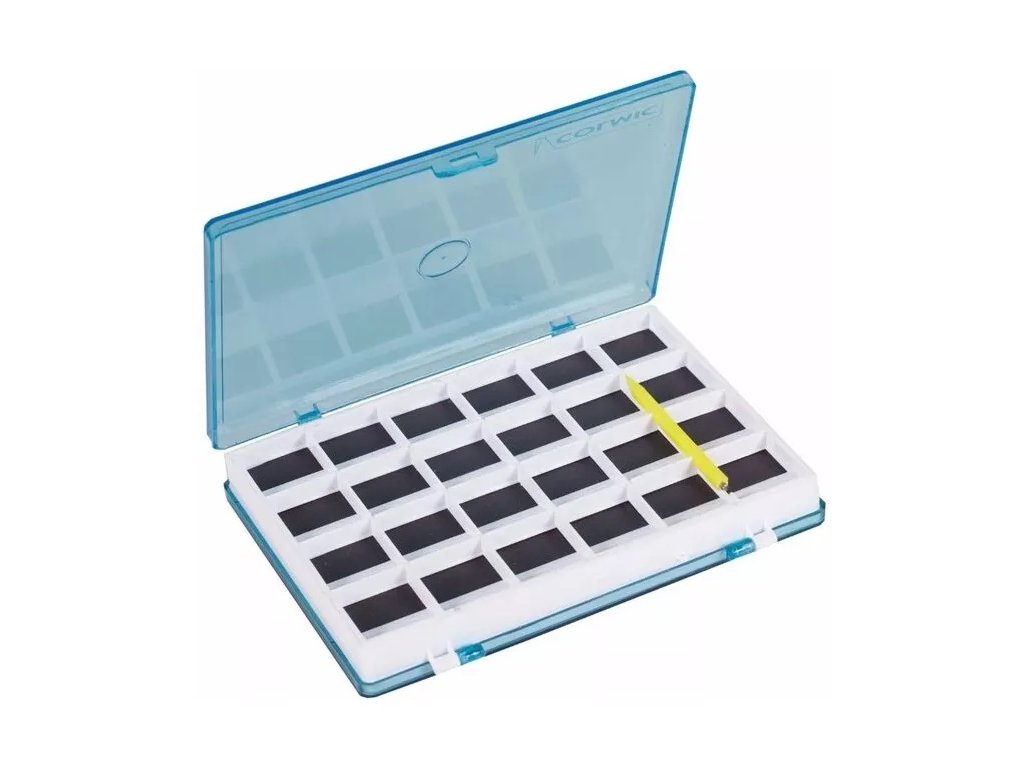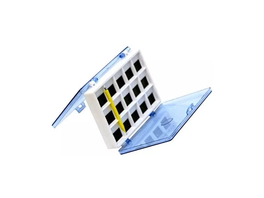 Praktikus mágneses doboz horgok tárolására. Ez a kétoldalas doboz egy műanyag ceruzával is rendelkezik, mágnesekkel a horgok kényelmes kivételéhez a mágneses mezőből.