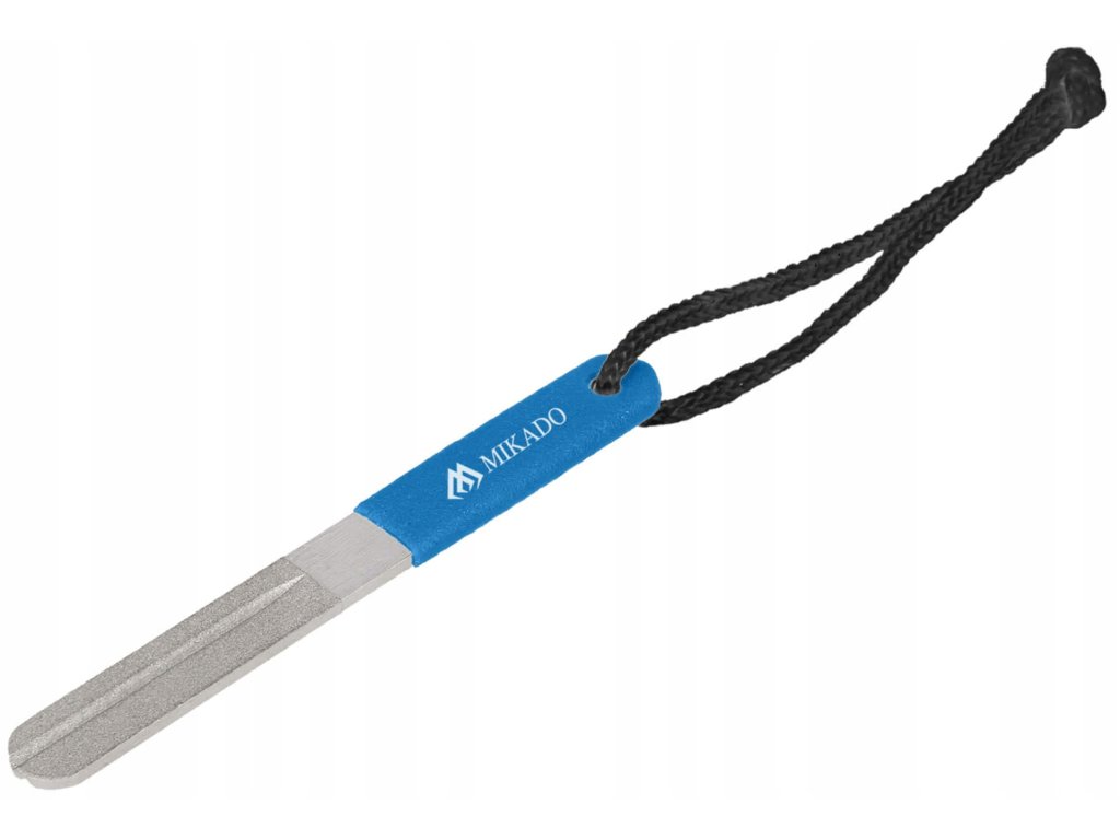 A gyémánt felület a kés élezésére szolgál, a horony pedig a horgok élezésére. A másik vége gumírozott fogantyúból áll.