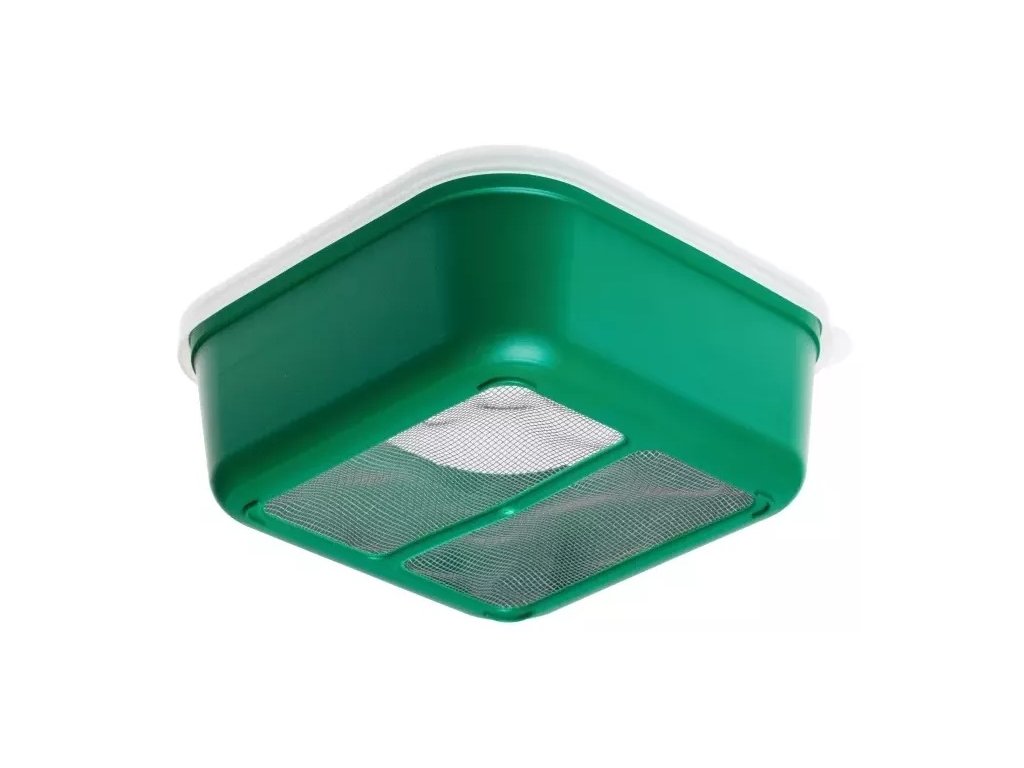Zöld színű műanyag doboz fedéllel. A dobozon belülről leolvasható űrmérték-skála található. A doboz alján található háló biztosítja, hogy az élő csali mindig szárazon maradjon.
