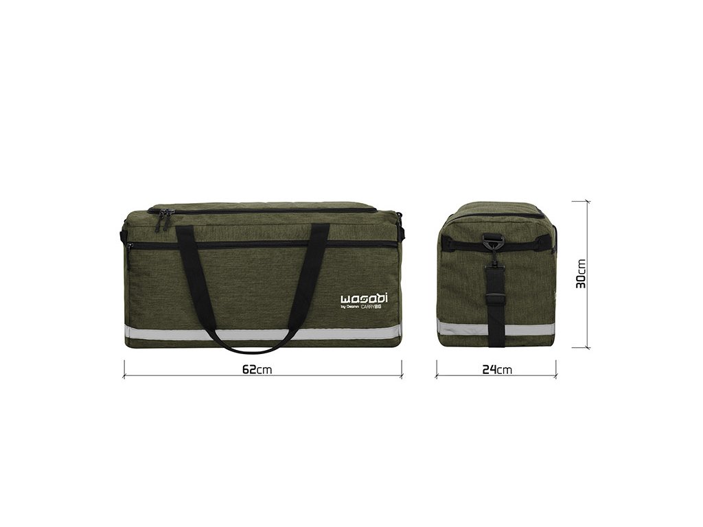 A kényelmes viselet érdekében a táska levehető, hosszában állítható vállpánttal és két kézi fogantyúval van ellátva. Minden pánt alaposan át van varrva, ami garantálja, hogy a WASABI CarryBig táska nagyobb súlyt is elbírjon nem kívánt sérülés nélkül. Az alján körben fényvisszaverő csík található, amely hozzájárul a biztonsághoz viselés közben, valamint a táska könnyebb azonosításához rossz látási viszonyok mellett, például éjszaka.