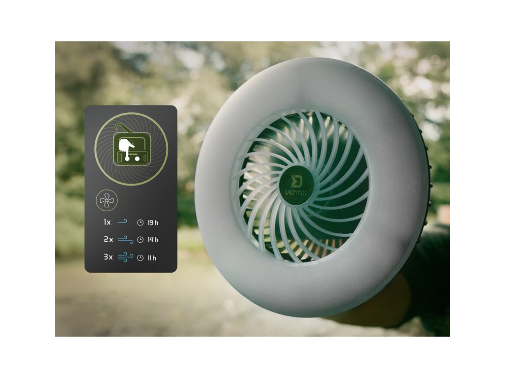 Csakúgy, mint a világítás, a ventilátor is három intenzitási módot kínál, így könnyen beállíthatja az aktuális hőmérsékleti viszonyoknak megfelelően. Az első érintéssel a ventilátor alacsony intenzitással indul, amelynél az akkumulátor akár 19 órán keresztül is bírja. A második érintés növeli a ventilátor teljesítményét, miközben az üzemidő körülbelül 14 órára rövidül. A harmadik érintéssel aktivált legnagyobb intenzitás mellett a ventilátor körülbelül 11 órán keresztül működik.