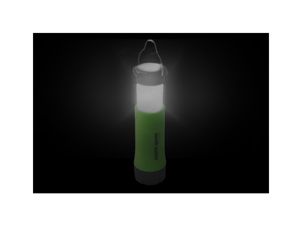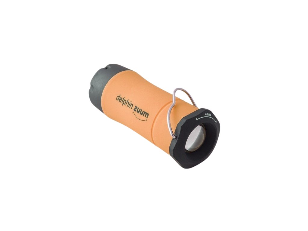 Használható klasszikus kézilámpaként, amikor a fénysugár az elforgatható fejből egyenesen világít. Elforgatása után a középső részt ki lehet húzni, így a zseblámpából lámpás lesz. Ez a lámpás önállóan áll, de a profilozott dróthorgának köszönhetően problémamentesen felakasztható. A tulajdonságok felsorolása még nem ért véget. Maga a LED dióda belül három világítási szinttel rendelkezik: erős fény, tompított fény és villogó stroboszkóp. A Delphin ZUUM lehetőségei tehát végtelenek, a klasszikus kézilámpától kezdve a függő lámpáson át a bivaklámpáig, pozíciós lámpáig... A ZUUM 3 színű testkialakításban kapható: zöld, narancssárga és kék.